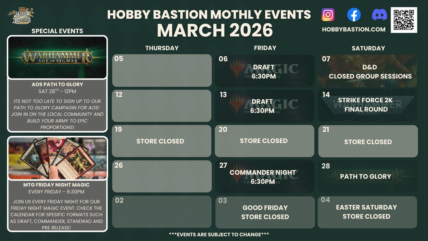 From Warhammer Tournaments to Star Wars Legion, Hobby Bastion constantly hosts tabletop gaming events. Supporting the best in tabletop wargaming, you can exspect to see; Warhammer 40K, Age of Sigmar, Dropzone, Battletech and many more... Check out our monthly calendar to see what events are happening during the month!